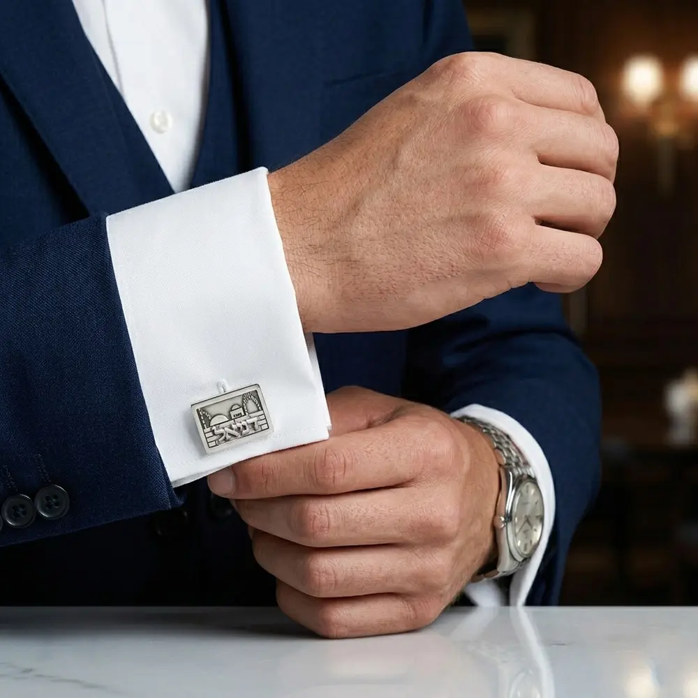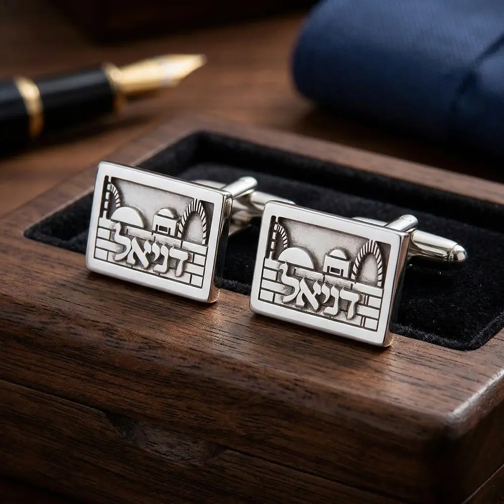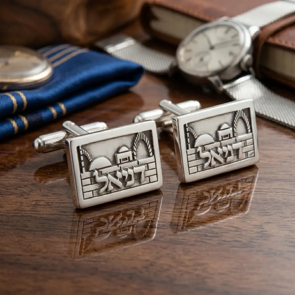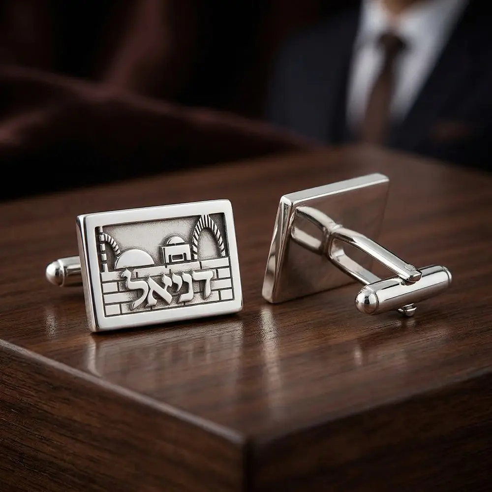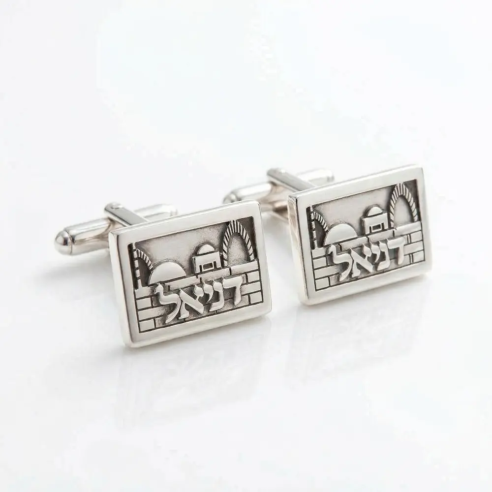 חפתים אישיים עשויים כסף אמיתי, בעיצוב ייחודי בהשראת נופי ירושלים. השם משולב כחלק בלתי נפרד מהדגם, ליצירת פריט אלגנטי עם נוכחות ומשמעות אישית.