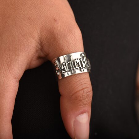 טבעת שם גותי לגבר עשוי כסף אמיתי 925. טבעת שם עבה לגבר עליה מוטבע שם בהתאמה אישית בפונט גותי באנגלית. כתב גותי עתיק מגיע מתקופת המאה ה 12 באירופה.הכתב מציג תחושה של עתיקות, אלגנטיות ודרמה. טבעת המשלבת זהות אישית ואופנה נועזת.