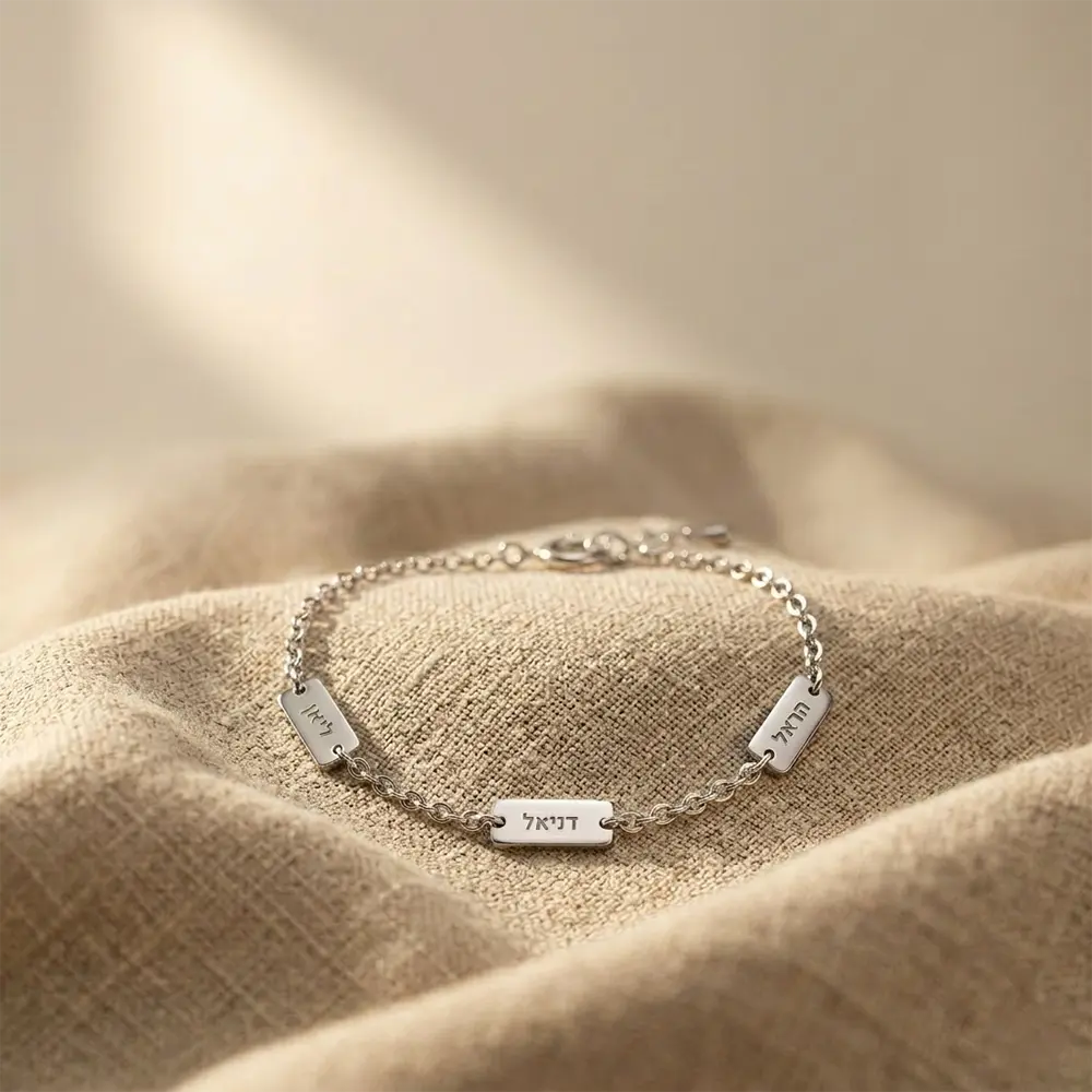 צמיד יוקרתי ועדין בעיצוב מלבנים קלאסי, עשוי זהב 14 קראט איכותי, המאפשר חריטה אישית של שמות הילדים על גבי פלטות עדינות ומעוצבות. ניתן לבחור עד 6 פלטות עם שם, כל פלטה מסמלת אהבה, חיבור ומשפחה, והופכת את הצמיד לפריט ייחודי עם משמעות עמוקה.