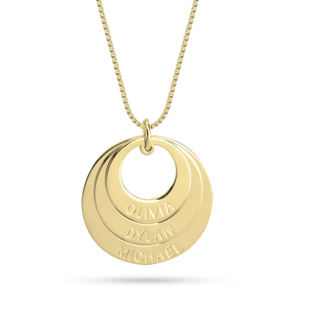 שרשרת תליונים עגולים בגדלים שונים עם חריטת שם על כל תליון. ניתן לחרוט שם בעברית או אנגלית.