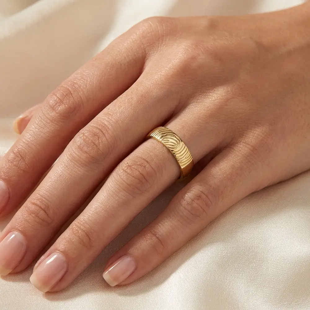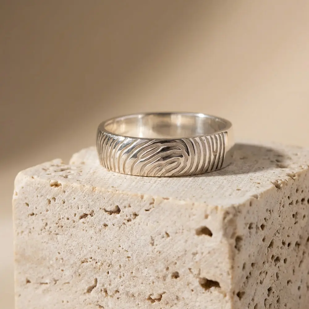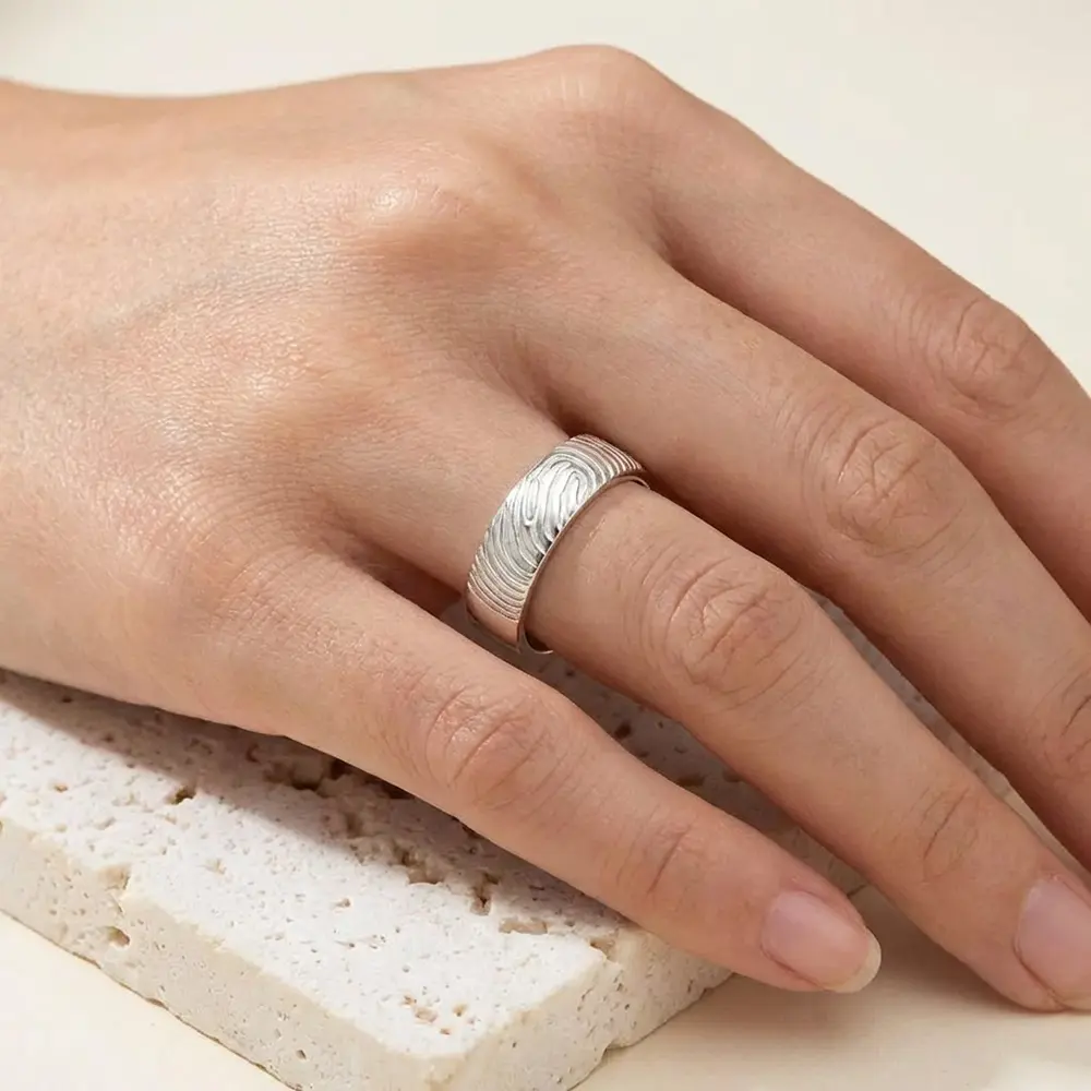 טבעת טביעת אצבע בהתאמה אישית מכסף אמיתי 925. הטבעת מעוגלת בצדדים ובעלת מראה מלוטש ועגול. רוחב הטבעת 5 מ”מ. ניתן להזמין את הטבעת בכל מידה. טבעת טביעת אצבע היא דרך מיוחדת ומקורית לשמור אהוב או אהובה הכי קרוב אליך. הטבעת מתאימה לנשים וגברים. ניתן להוסיף חריטה בחלקה הפנימי של הטבעת.