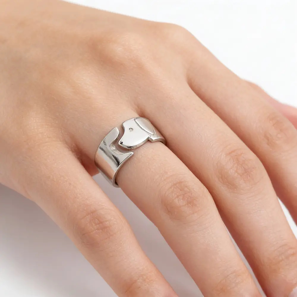 טבעת כסף מרשימה בעיצוב כלב מודרני ואלגנטי, המשלבת קווים חלקים עם מראה פיסולי ייחודי. הטבעת מעוצבת כטבעת רחבה ובולטת, עם ראש כלב מינימליסטי המשתלב בצורה הרמונית סביב האצבע ויוצר פריט תכשיט שהוא גם אמירה עיצובית.