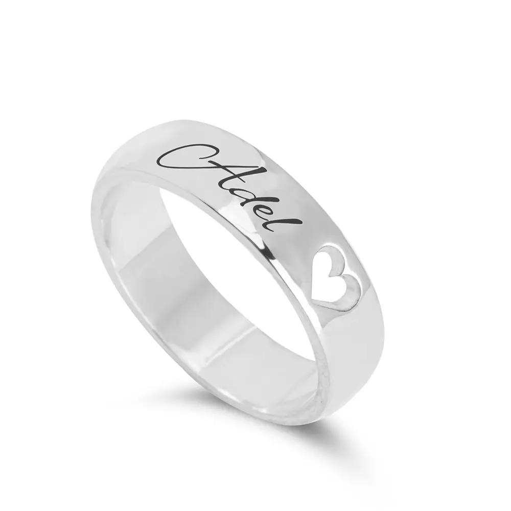 טבעת לב חלול וחריטת שם – טבעת כסף אישית ומרהיבה בעיצובה, עשויה מכסף אמיתי 925, עם חריטת שם לבחירתך ולב חלול עדין בצד.