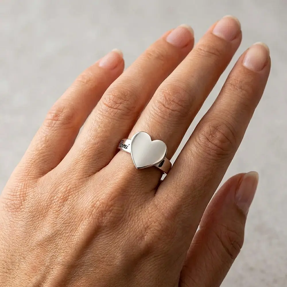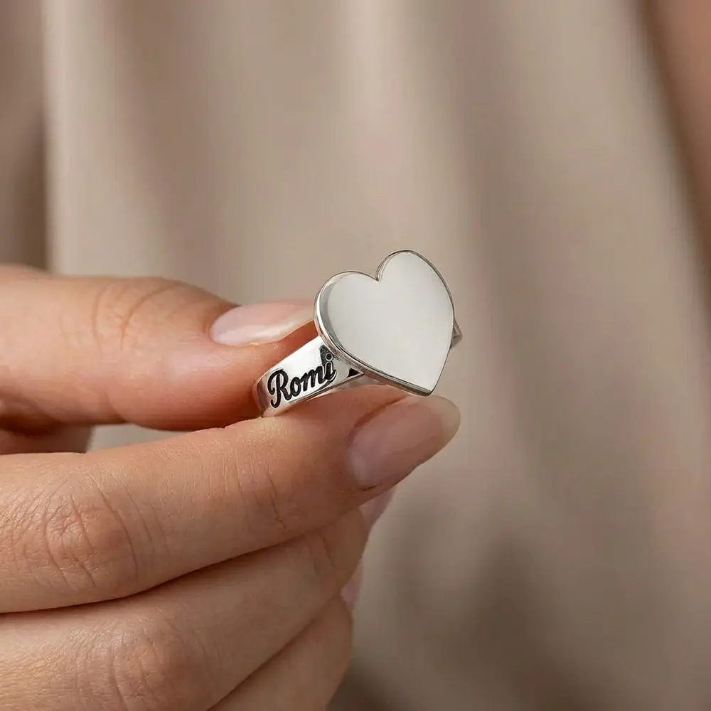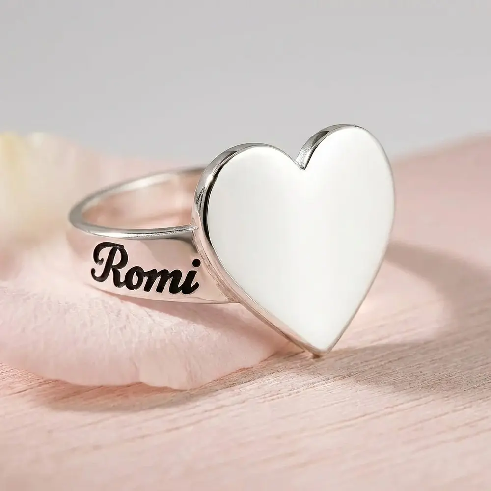 טבעת לב וחריטה של 2 שמות – כל שם יופיע לצד הלב: שם ראשון מימין ללב ושם שני משמאל ללב.