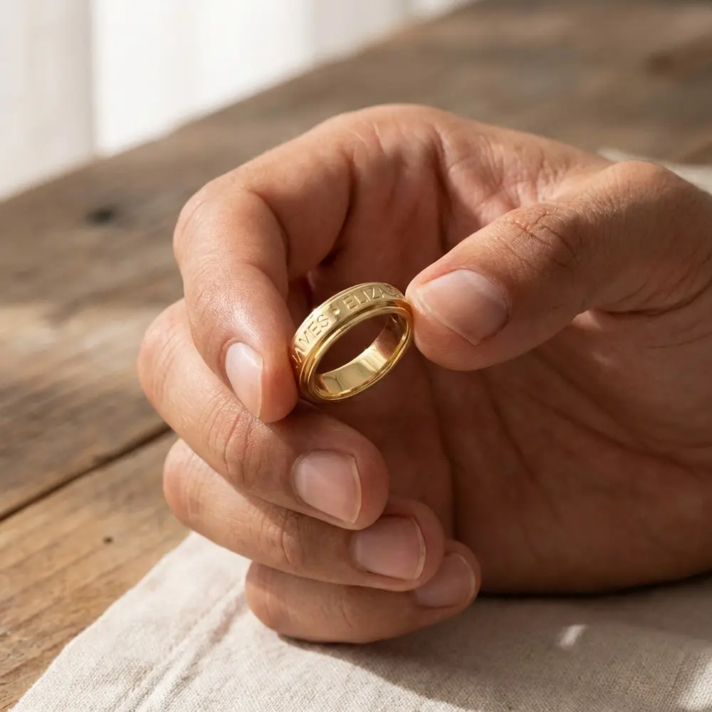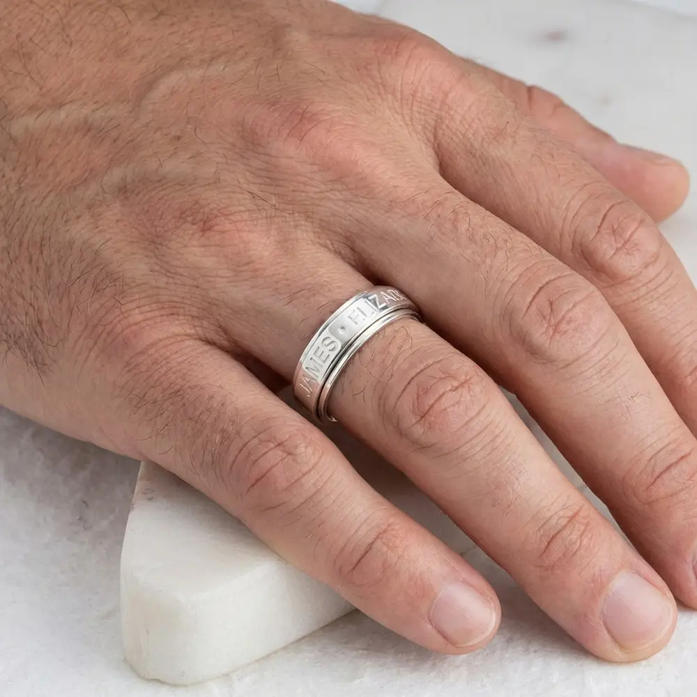 טבעת מסתובבת עם חריטת שמות או משפט. טבעת מיוחדת עם חריטת שמות בהתאמה אישית. ניתן לחרוט עד 5 שמות או משפט קצר. הטבעת עשויה כסף אמיתי 925 עם אפשרות לציפוי זהב 24 קרט. (לא ניתן לבקש החזרה על מנת להקטין או להגדיל את הטבעת לאחר הרכישה)