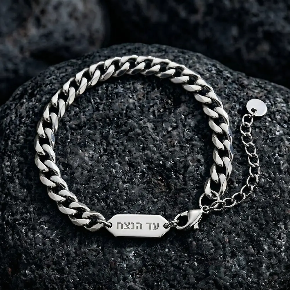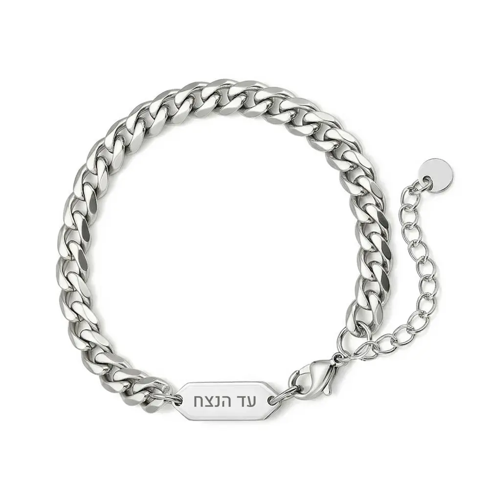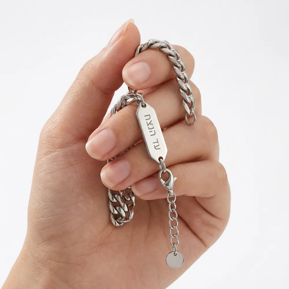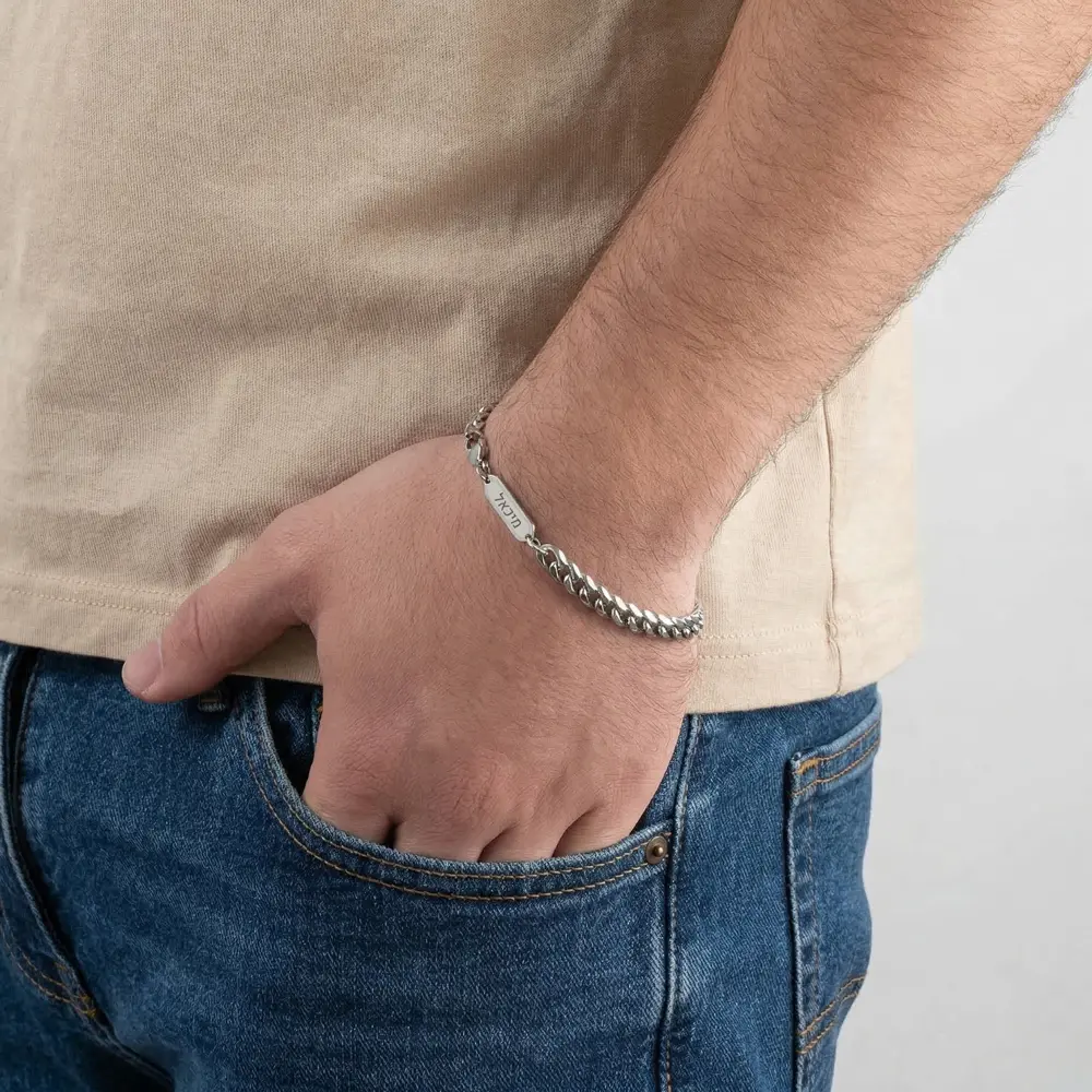 צמיד גורמט קלאסי עם תג חריטה בסוגר בעיצוב גברי ונקי, עשוי פלדת אל חלד איכותית בגימור מבריק.