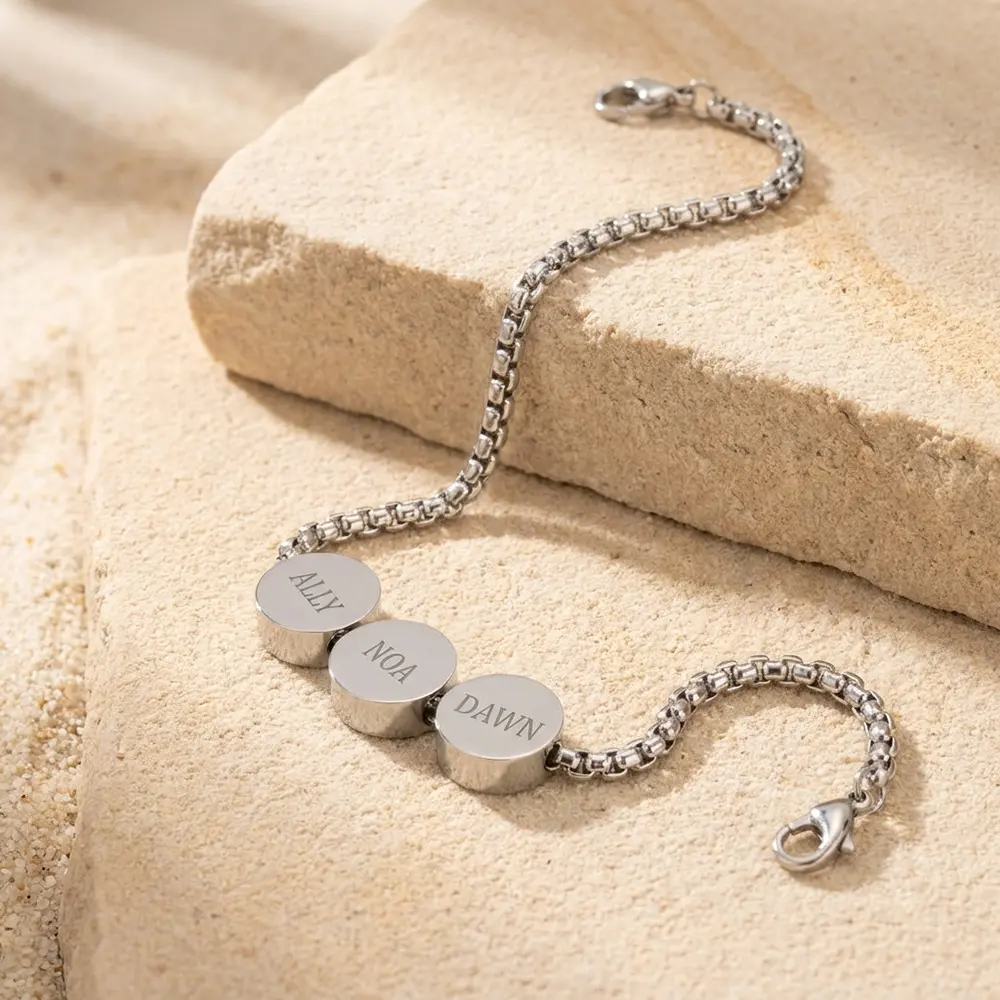 צמיד חריטה לאישה עם תליונים עגולים. על כל תליון אפשר לחרוט שם, מילה, תאריך ואפילו סמלים פשוטים כמו לב.
