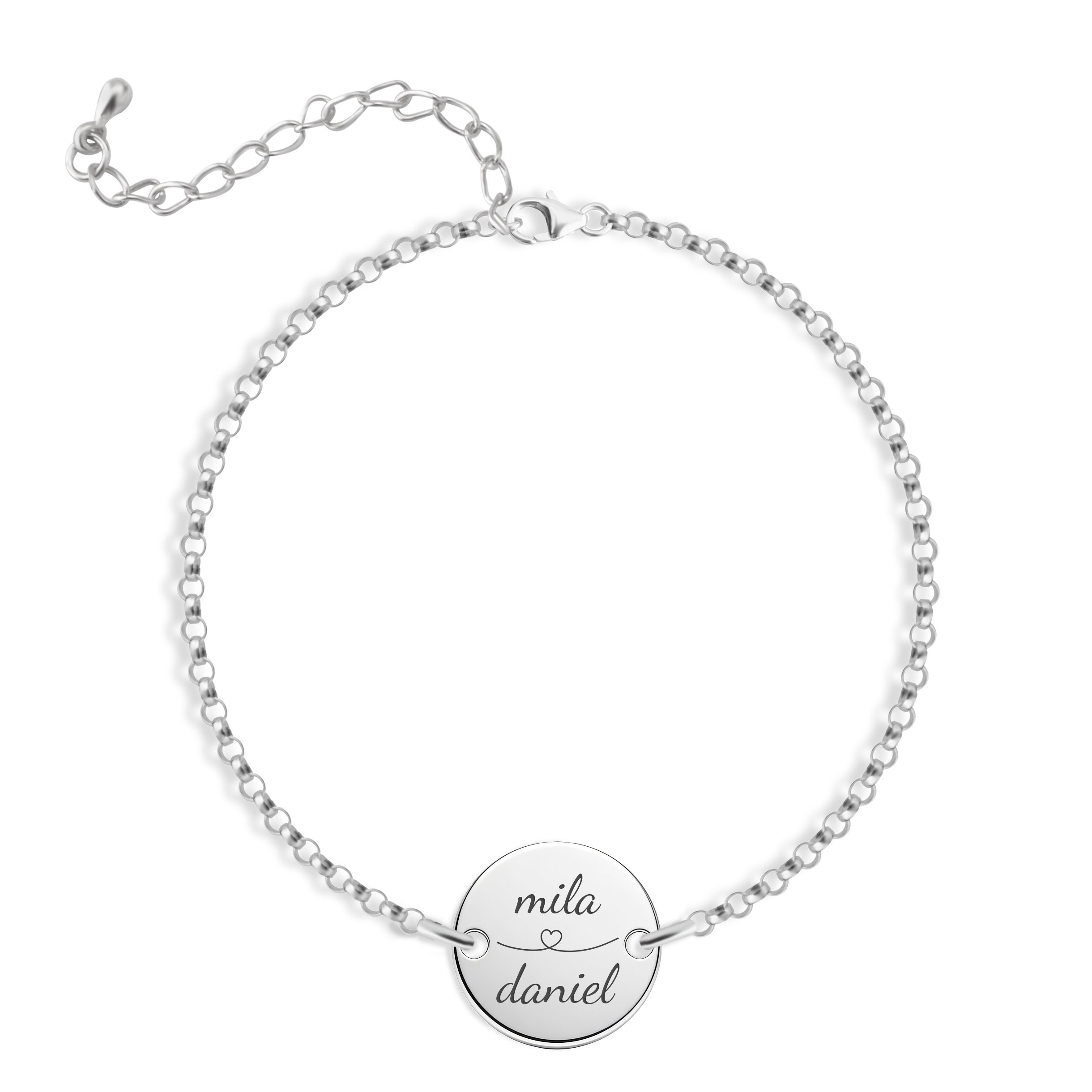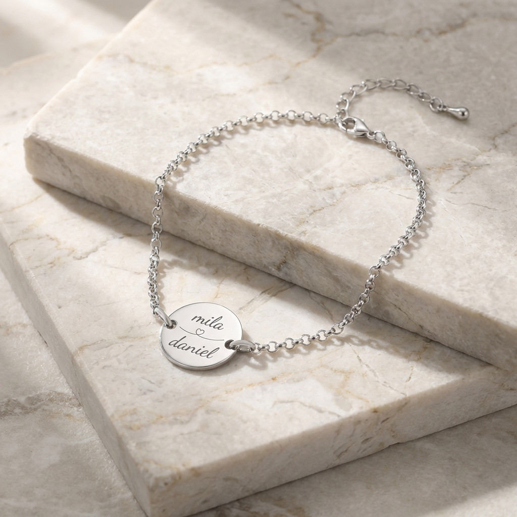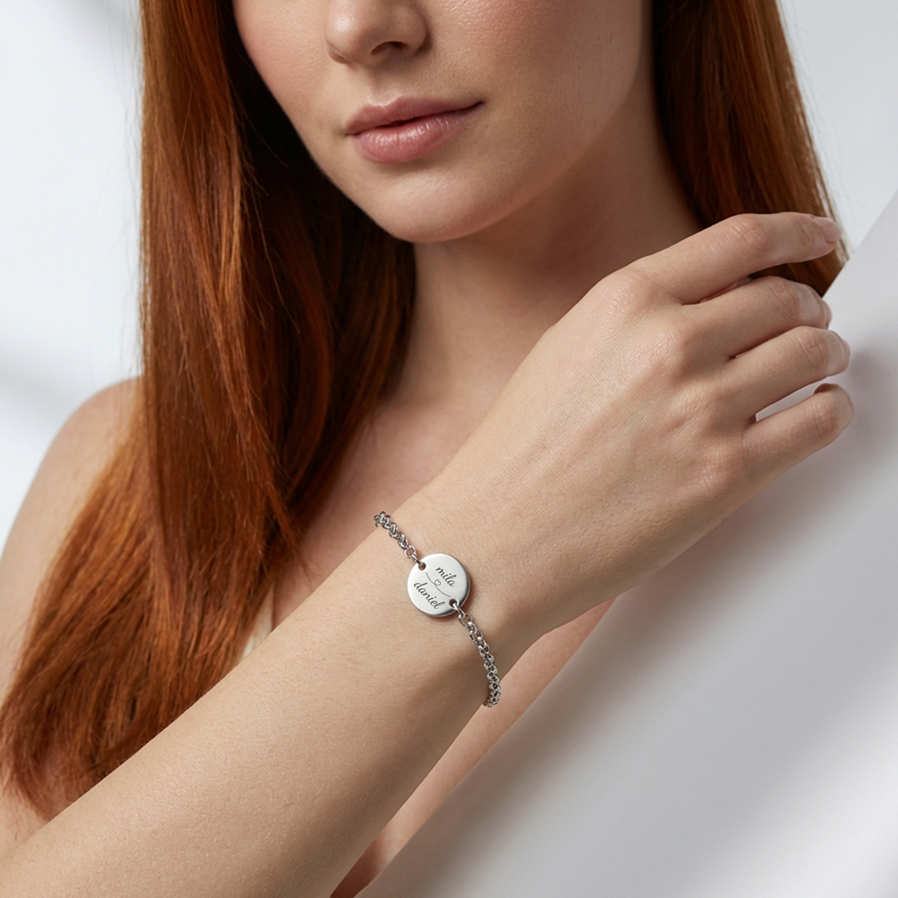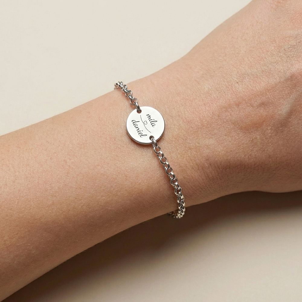 צמיד עגול ועדין עם חריטת שמות בהתאמה אישית, בעיצוב קלאסי ונקי שמתאים לכל סגנון. במרכז הצמיד תליון עגול וחלק, עליו נחרטים שמות לבחירתך, ליצירת תכשיט אישי עם משמעות ורגש.