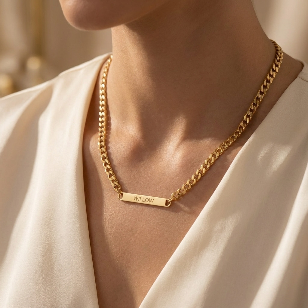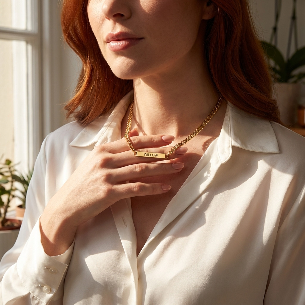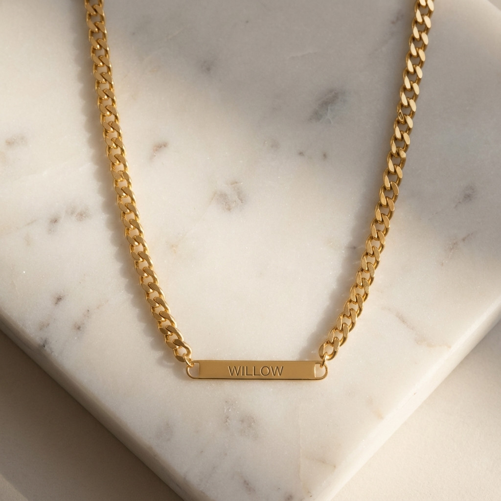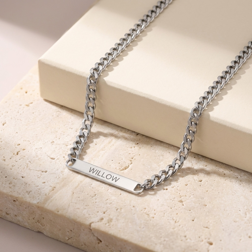 שרשרת בר אלגנטית עם חריטת שם אישית, בעיצוב נקי ועדין שמדגיש מראה נשי ומודרני. התליון מיוצר מפלדת אל־חלד איכותית ועמידה במיוחד, ומתאים לשימוש יומיומי.