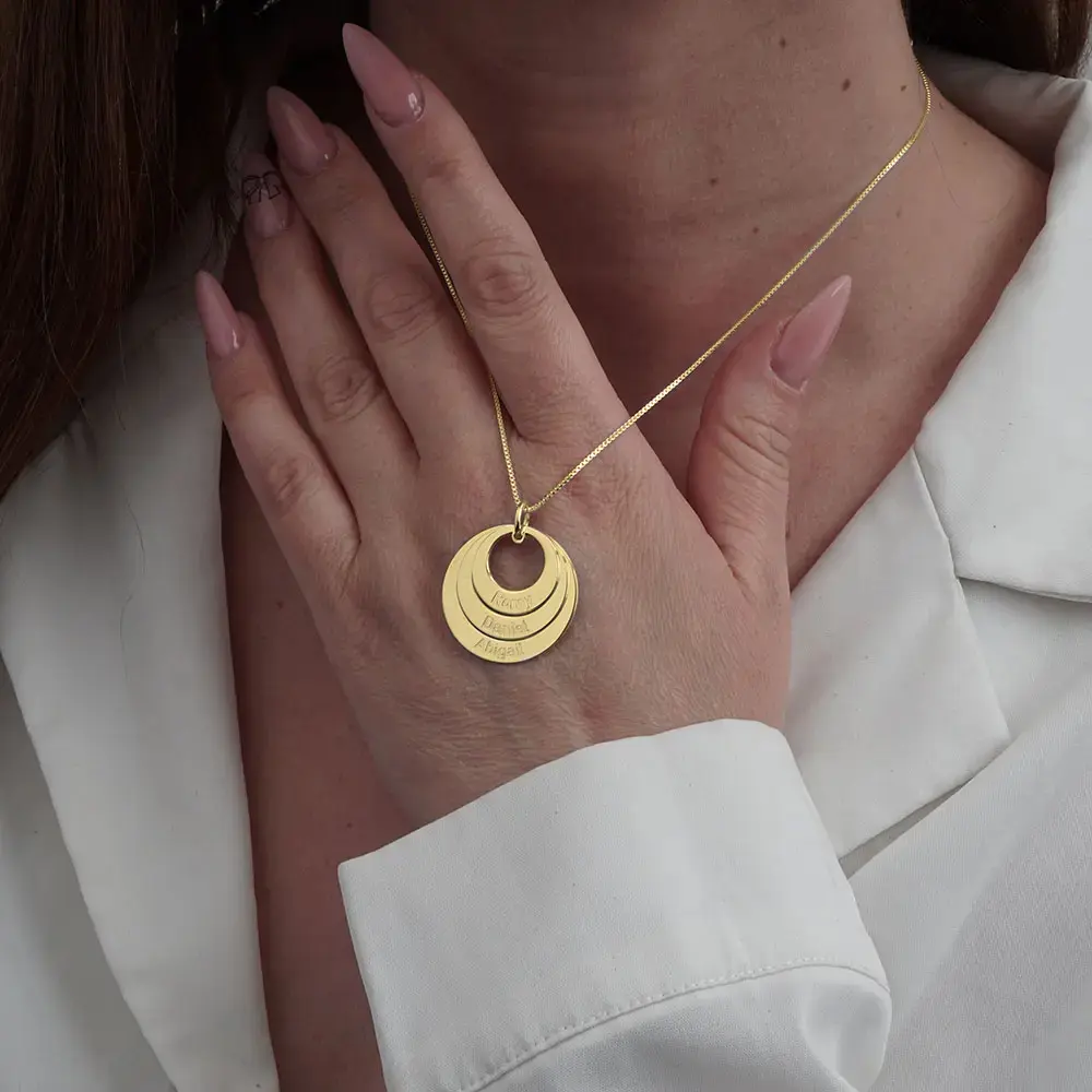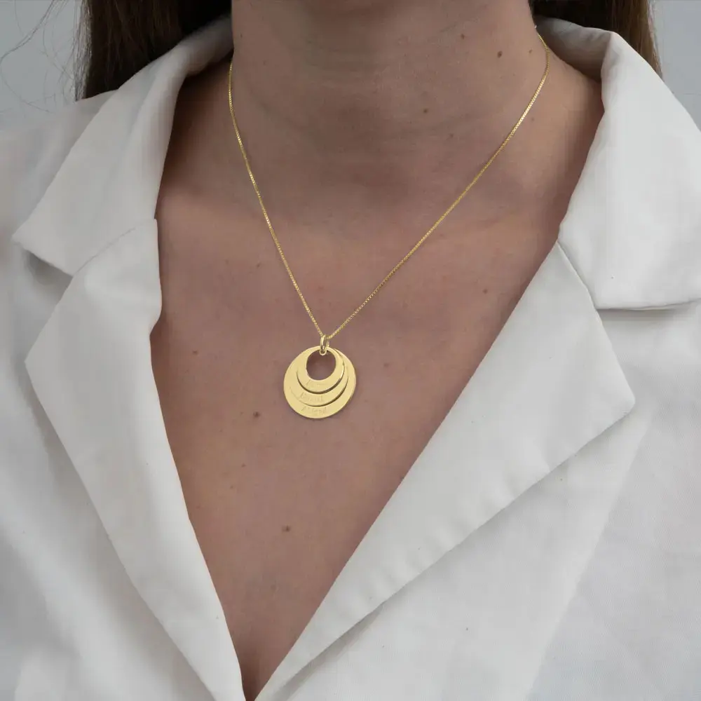 שרשרת תליונים עגולים בגדלים שונים עם חריטת שם על כל תליון. ניתן לחרוט שם בעברית או אנגלית.