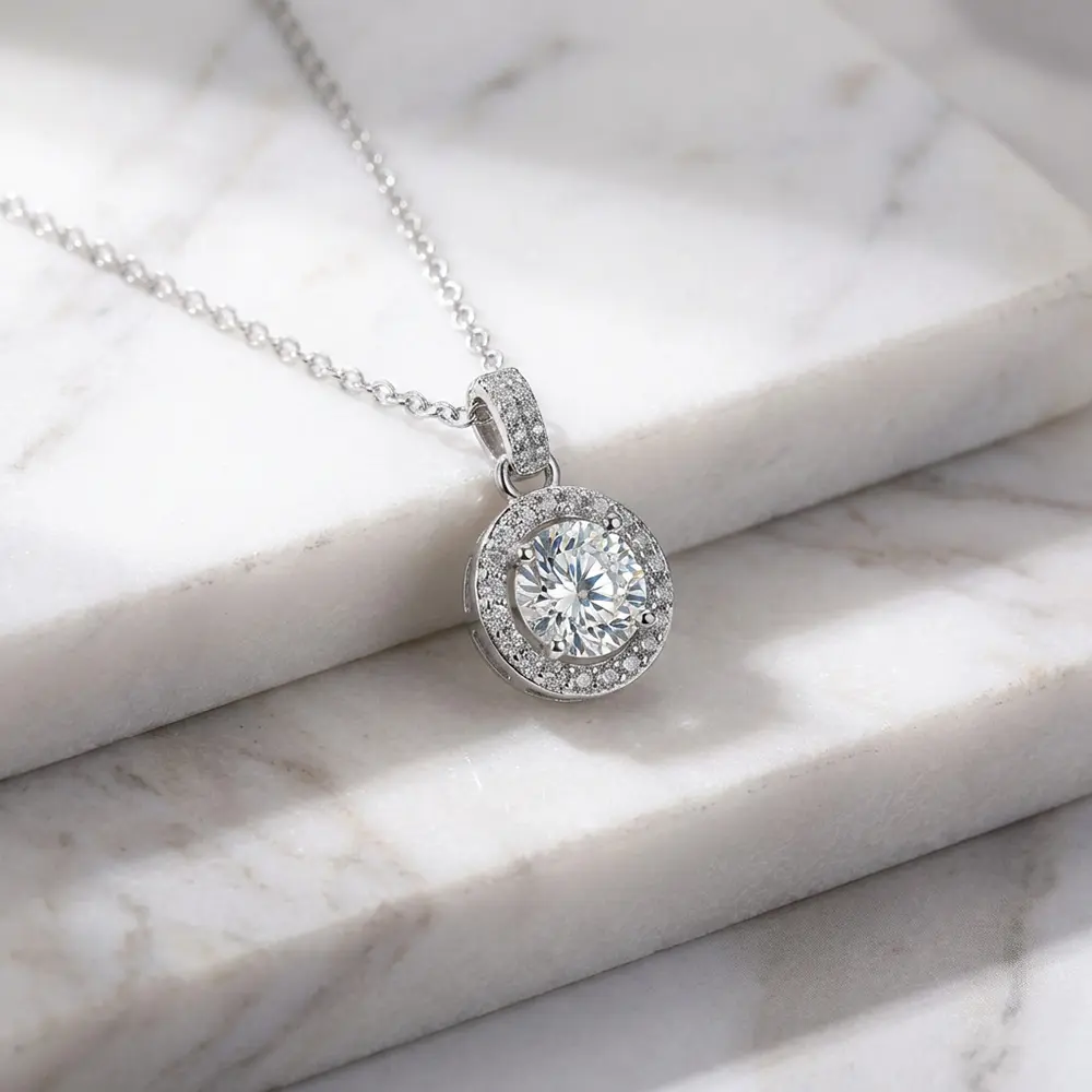 שרשרת תליון עגול משובץ יהלום מואסניט גדול במרכז ומסביבו יהלומי מואסניט משובצים. התליון עצמו והשרשרת עשויים כסף אמיתי 925