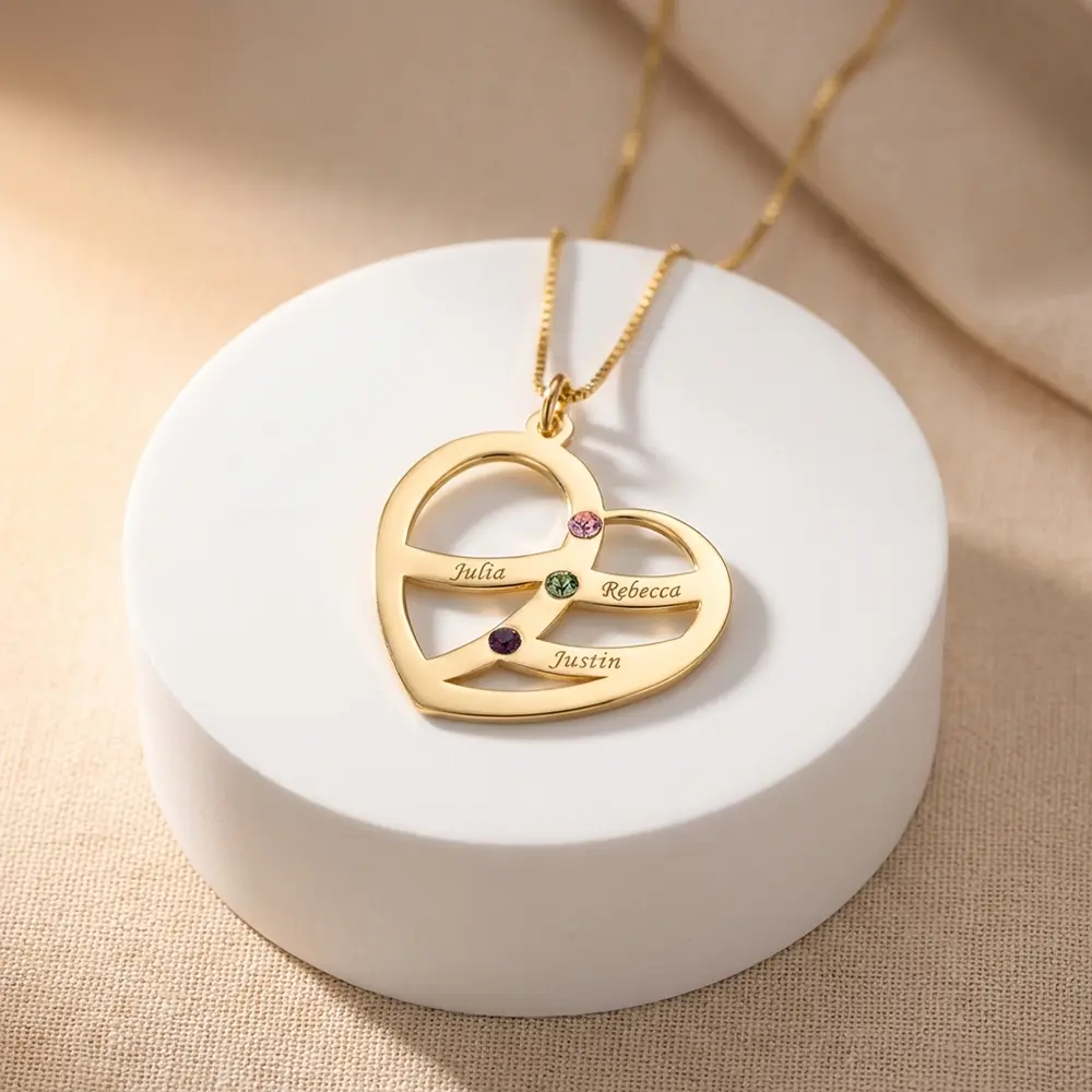 שרשרת לב עם חריטת שמות הילדים ואבן לפי חודש לידה • ציפוי זהב 24K