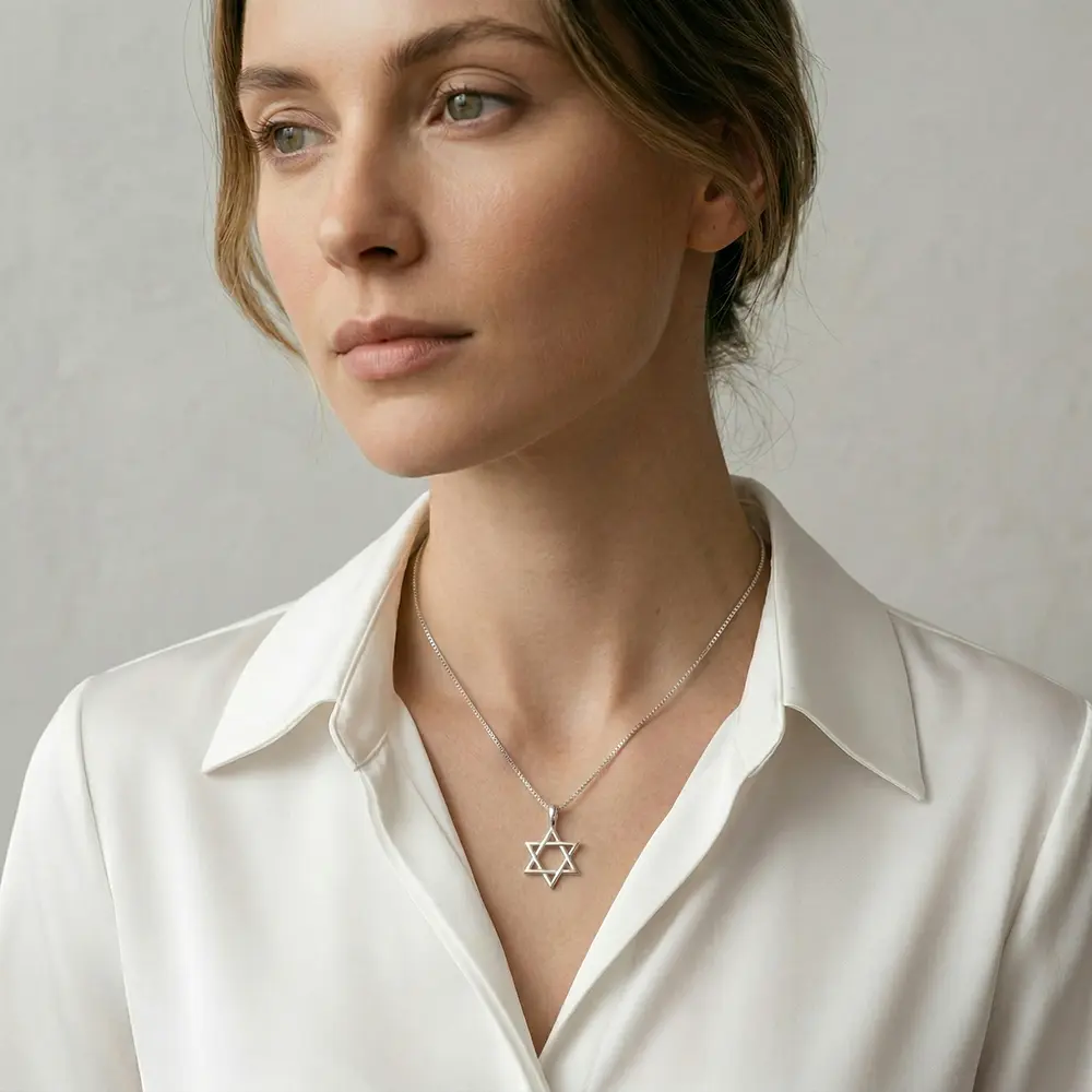 שרשרת תליון מגן דוד קלאסית עשויה מכסף סטרלינג 925 איכותי במיוחד, כולל שרשרת באורך לפי בחירה.