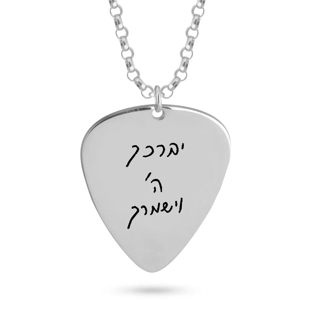 שרשרת מפרט עם חריטת כתב יד מותאמת אישית עשוי כסף אמיתי 925. שרשרת בעיצוב מפרט גיטרה היא תכשיט ייחודי בהשראת אומני הגיטרות והמוזיקאים. על המפרט ניתן לחרוט בכתב יד אישי מילות שיר אהוב, תאריך משמעותי או כל משהו אחר שיהפוך את השרשרת לזיכרון מיוחד. שרשרת זו נלבשת כביטוי עצמי,הערכה למוזיקה ומסמלת יצירתיות מוזיקלית. מתנה מושלמת וייחודית לאוהבי וחובבי הגיטרה.