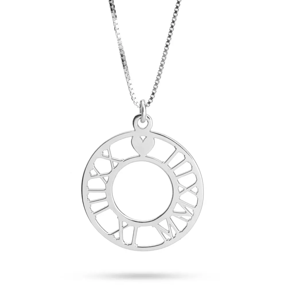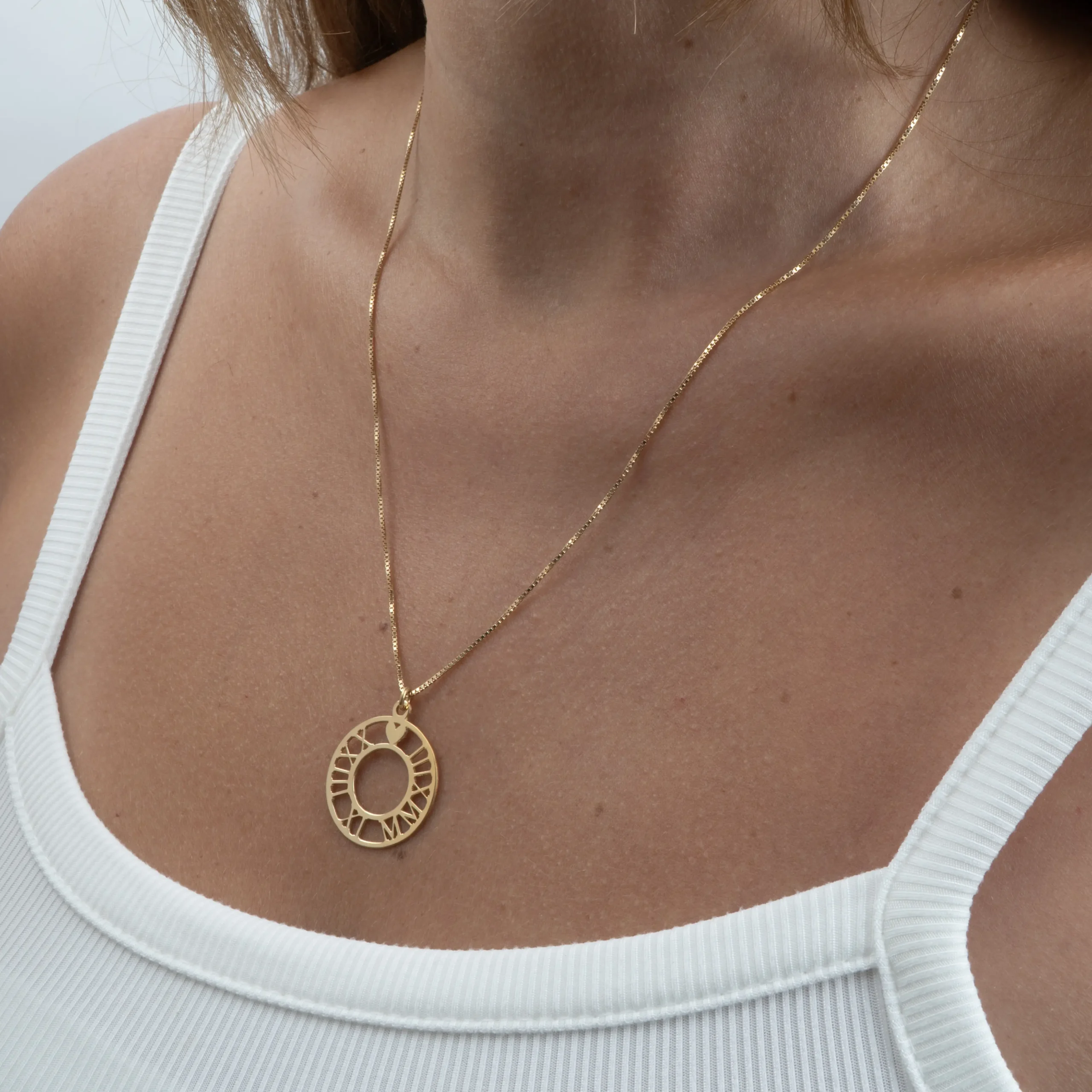 תכשיט אלגנטי וייחודי המשלב בין סמליות הזמן לבין עיצוב מינימליסטי ונצחי. התליון המעוגל מציג תאריך רומי בחיתוך מדויק ועדין, בהשראת שעוני קיר וארכיטקטורה קלאסית, כסמל למחזוריות החיים, המשכיות וערכים על-זמניים.