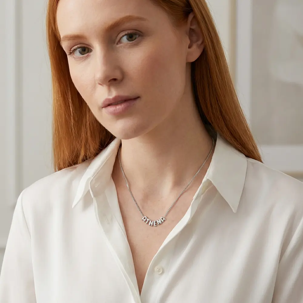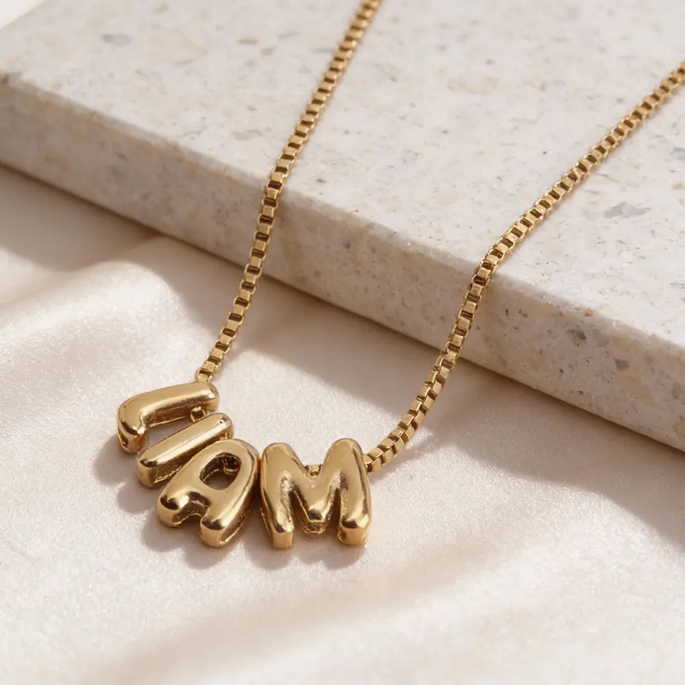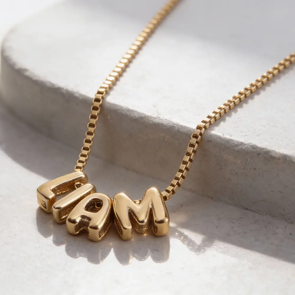 שרשרת שם אותיות בלון בעיצוב אישי. שרשרת מלאת אופי עם שם מעוצב באותיות בלון תלת ממדיות, היוצרות מראה רך, עגול ושובב עם נוכחות בולטת. האותיות מעוצבות בסגנון חלק ומבריק, ומשתלבות יחד לשרשרת אישית, מודרנית ומלאת סטייל.