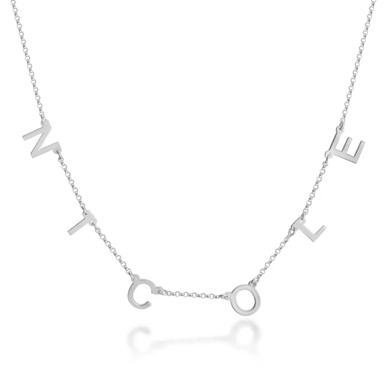 שרשרת שם המורכב מאותיות המחוברת במרווחים על השרשרת. רצף האותיות יכול להרכיב שם, מילה או כל צירוף אחר של אותיות. ניתן להכניס בשרשרת עד 8 אותיות. התכשיט עשוי כסף אמיתי 925