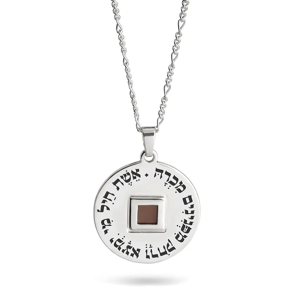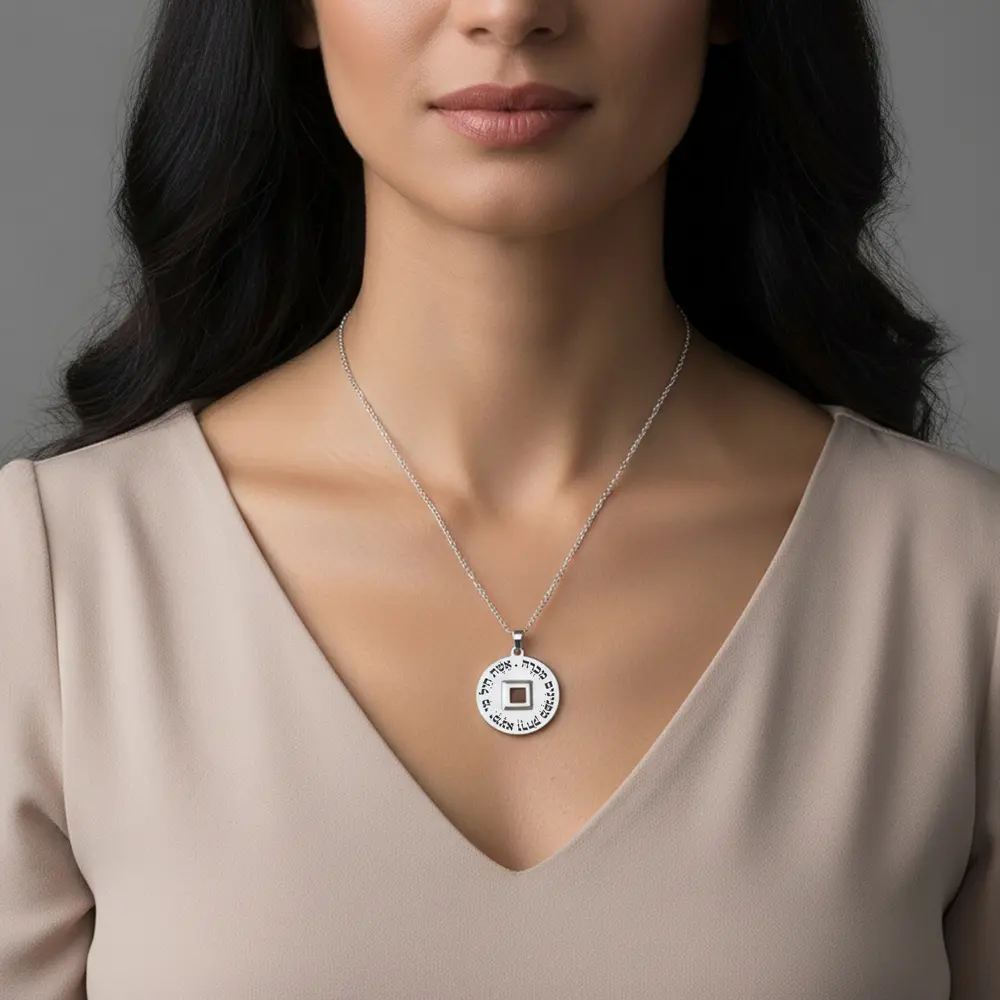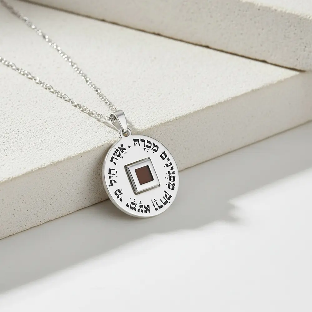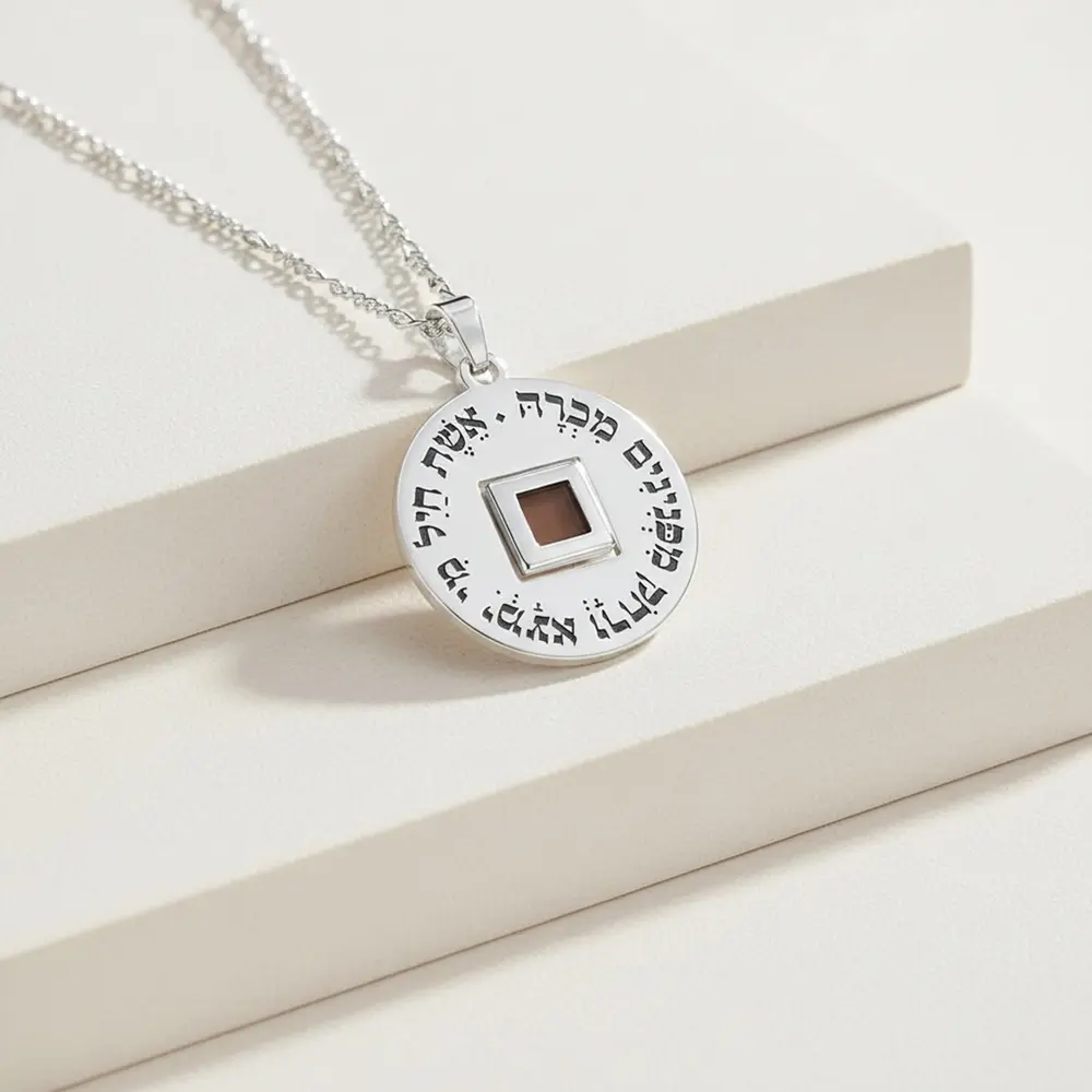 מסביב למרכז מופיע הפסוק “אשת חיל מי ימצא”, חריטה מדויקת ואלגנטית שמעניקה לתכשיט מראה קלאסי, רוחני ומשמעותי.