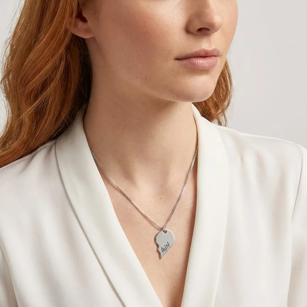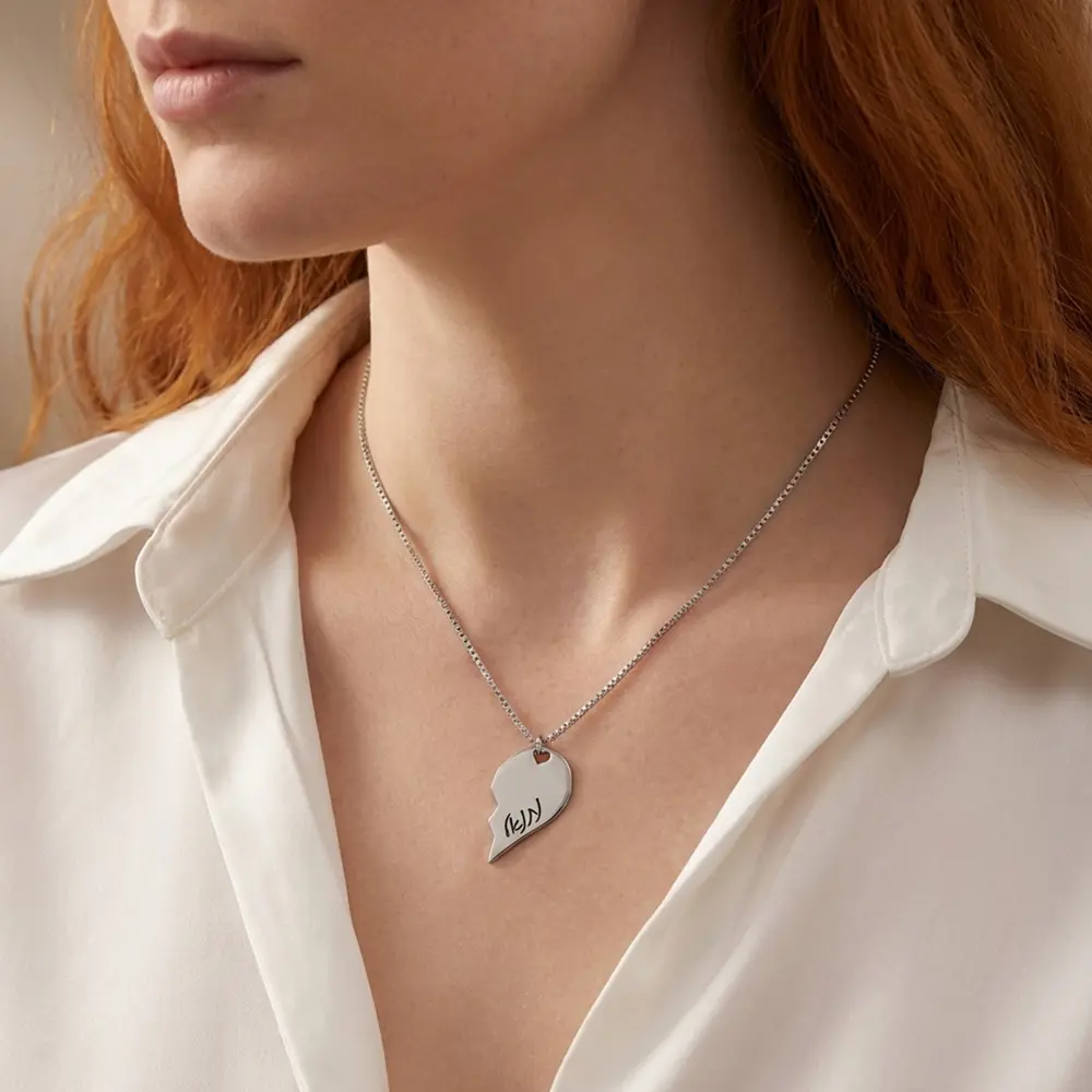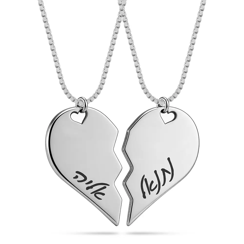 סט 2 שרשראות לב חצוי עם חריטה של שם, מתנה רומנטית מושלמת לבני זוג!